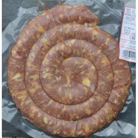 Saucisse 100% poulet réalisée dans l'atelier de découpe du Gaec. Composition: Cuisse de poulet désossée puis moulinée Sel,poivre bio Laure utilise du boyau d'agneau pour confectionner ses saucisses