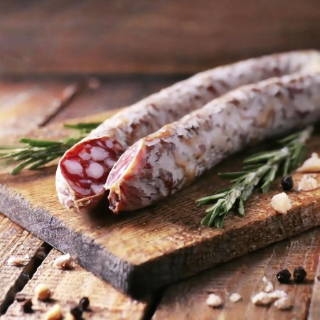 Cette saucisse sèche ne contient qu'entre 5.4 et 6 mg de sel nitrité/kg de viande afin de lutter efficacement contre certaines bactéries et de permettre une meilleure conservation. Elle est séchée de façon à faire ressortir toutes ses saveur, de quoi vous régaler !