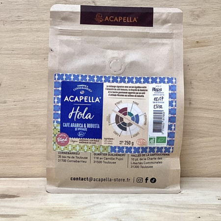 Le Café Hola Bio est le blend signature d’Acapella, imaginé pour offrir une tasse à la fois intense, gourmande et parfaitement équilibrée. Ce mélange réunit la puissance du robusta, la vivacité d’un arabica du Honduras et la rondeur d’un café d’altitude bolivien, aux notes de noisette et de fruits secs. Torréfié près de Toulouse, il développe un profil harmonieux mêlant abricot, cacao riche et touches boisées, avec une belle longueur en bouche. Polyvalent et savoureux, le HOLA s’adapte à toutes les méthodes, en grains ou moulu à la demande. Un café bio qui accompagne chaque moment de la journée avec caractère et douceur.