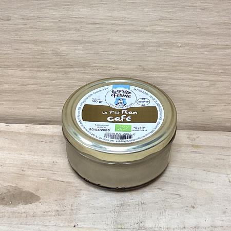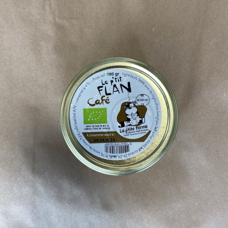 Flan au café Composition: LAIT entier de vache* (44.6%),LAIT écrémé* (26.2%),OEUFS* (19.3%),sucre de canne* (9.2%),café lyophilisé* (0.7%). * Issus de l'agriculture biologique. Fabriqué dans le Tarn-et-Garonne (Caussade).