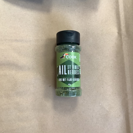 Le mélange Ail et Fines Herbes de la marque Cook est une association équilibrée d'ail séché et d'herbes aromatiques comme le persil et la ciboulette,idéale pour relever les plats du quotidien. Polyvalent et 100 % biologique,il apporte une touche fraîche et savoureuse aux marinades,sauces,légumes ou préparations à base de fromage.