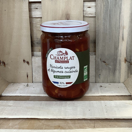 Légumes* 48% (carottes*, tomates* 17%, poivrons* 6%, oignons*), haricots rouges réhydratés* 25%, eau, maïs* 6%, huile d'olive vierge extra*, sel de Guérande, ail*, épices* (dont piment* 0,004%)*Issu de l'agriculture biologique
