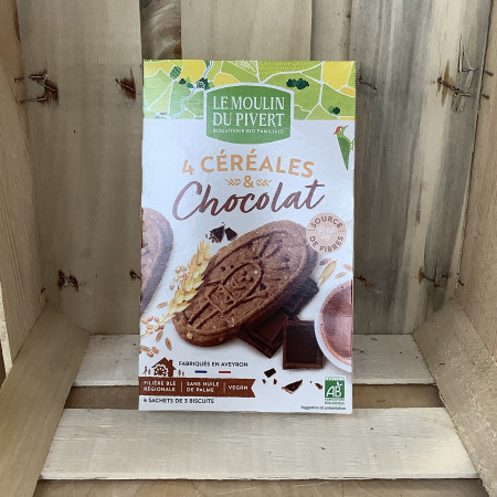 Farine de blé* T65 (39%), sucre non raffiné*, huile de tournesol*, pépites de chocolat noir* (9,4%) (sucre*, masse de cacao*, beurre de cacao*, extrait de vanille*), flocons d'avoine* (8,6%), beurre de cacao*, sirop de blé*, farine de seigle* T130 (4,2%), farine d'orge* T110 (4,2%), cacao maigre en poudre* (2,1%), fibre d'avoine*, sel de mer, poudres à lever : carbonates de sodium et carbonates d'ammonium, jus concentré de citron*.
