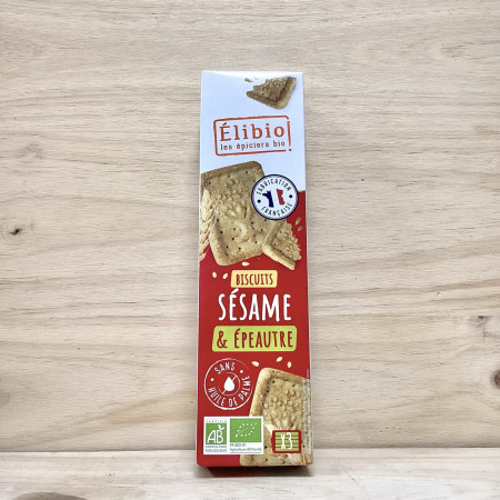Farine de blé*, sucre*, farine d’épeautre* 17,5%, beurre*, graines de sésame* 11,5%, huile de colza*, amidon de blé*, poudre de lait écrémé*, poudres à lever : carbonates de sodium – carbonates d’ammonium, sel marin, arôme naturel de vanille.