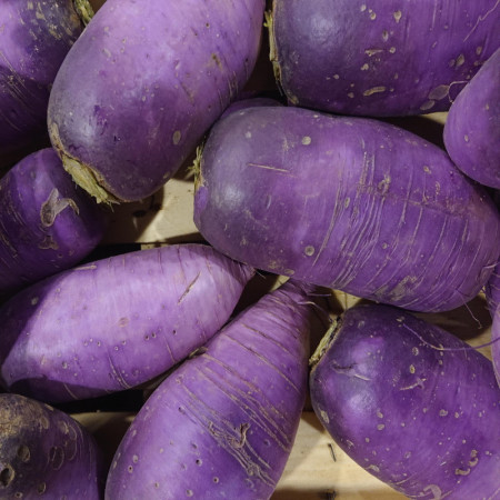 On reconnait le radis blue meat à sa forme allongée et à sa peau violette sur la partie supérieure et blanche sur la partie inférieure.