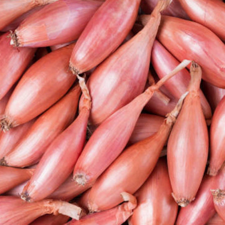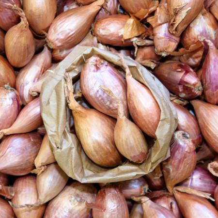 L'échalote est une plante bulbeuse traditionnelle de la gastronomie française. Habillée de rouge cuivrée et de forme allongée,sa chair est blanche voire rosée. Crue ou cuite,avec son goût sucrée,l'échalote se présente comme un excellent condiment. En plus de cela,elle se trouve toute l'année !
