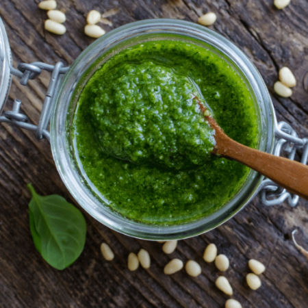 Huile d'olive(50%), basilic (40%), pignons de pin, ail, sel
