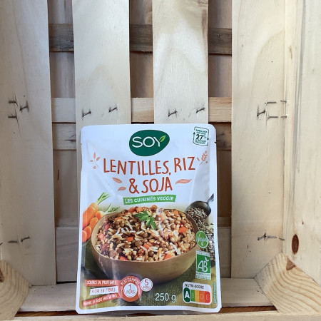 Carottes* 24%, eau, lentilles vertes* 14%, riz basmati complet* 12%, oignons* 12%, protéines de soja*(1) texturées et réhydratés 6%, sauce soja* (eau, soja*, blé*, sel ) huile d’olive* extra vierge, huile de tournesol* désodorisée, sel de mer. Fabriqué dans un atelier qui utilise céleri, moutarde, fruits à coque, oeufs, lait et sésame.