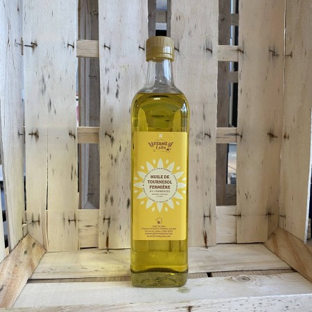 Une huile de tournesol qui est issue des grains cultivés dans les champs de la Ferme O Pâtes et pressés à la ferme avec leur propre presse : c'est une huile obtenue par première pression à froid.