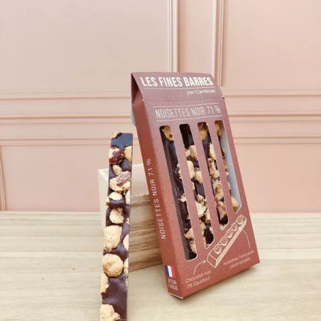 Les Croq'noisettes : barrette de chocolat noir 71% origine Equateur recouverte de noisettes françaises entières subtilement sucrés/salés. De la gourmandise à l'état pur!