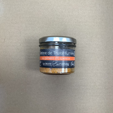Ingrédients: Truite (31%),truite fumée (31%),crème fraîche (lait),beurre (lait),œuf,chapelure (farine de blé),lait,huile d'olive,concentré de tomate,poivre piment d’Espelette (0.2%).
