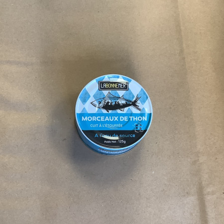 Thon cuit à l’étouffée, accompagné d’eau de source. Fabrication française.