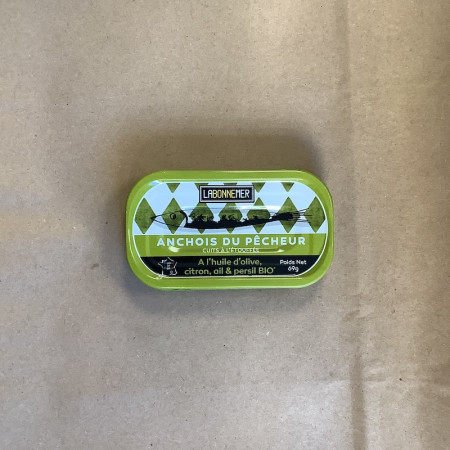 Ingrédients : anchois sauvages (Engraulis encrasicolus) 70 %, huile d’olive vierge extra*, citron* 2 %, ail* 1,5 %, sel, persil* 0,5 %. (*29,2 % des ingrédients agricoles sont issus de l’agriculture biologique).