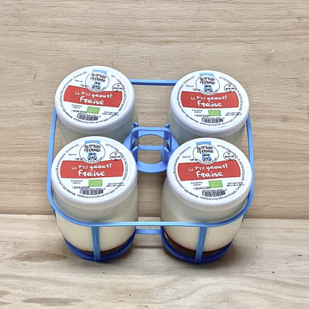 Yaourts Fermiers nature et à la confiture de fraise bio . Pot de 125 g La confiture que Nicolas utilise est produite en France avec des fraises produits eux aussi en France. Fabriqués à la ferme par Nicolas Teyssedou et son équipe Nicolas veille particulièrement à maitriser l'acidité de ses yaourts,vous pourrez donc apprécier sereinement ces yaourts. Livrés dans de petits paniers que nous récupérons lors de votre prochaine livraison. Vous pouvez aussi y joindre les pots de yaourts que vous aurez préalablement lavés. Ainsi nous évitons les gaspillage inutile.